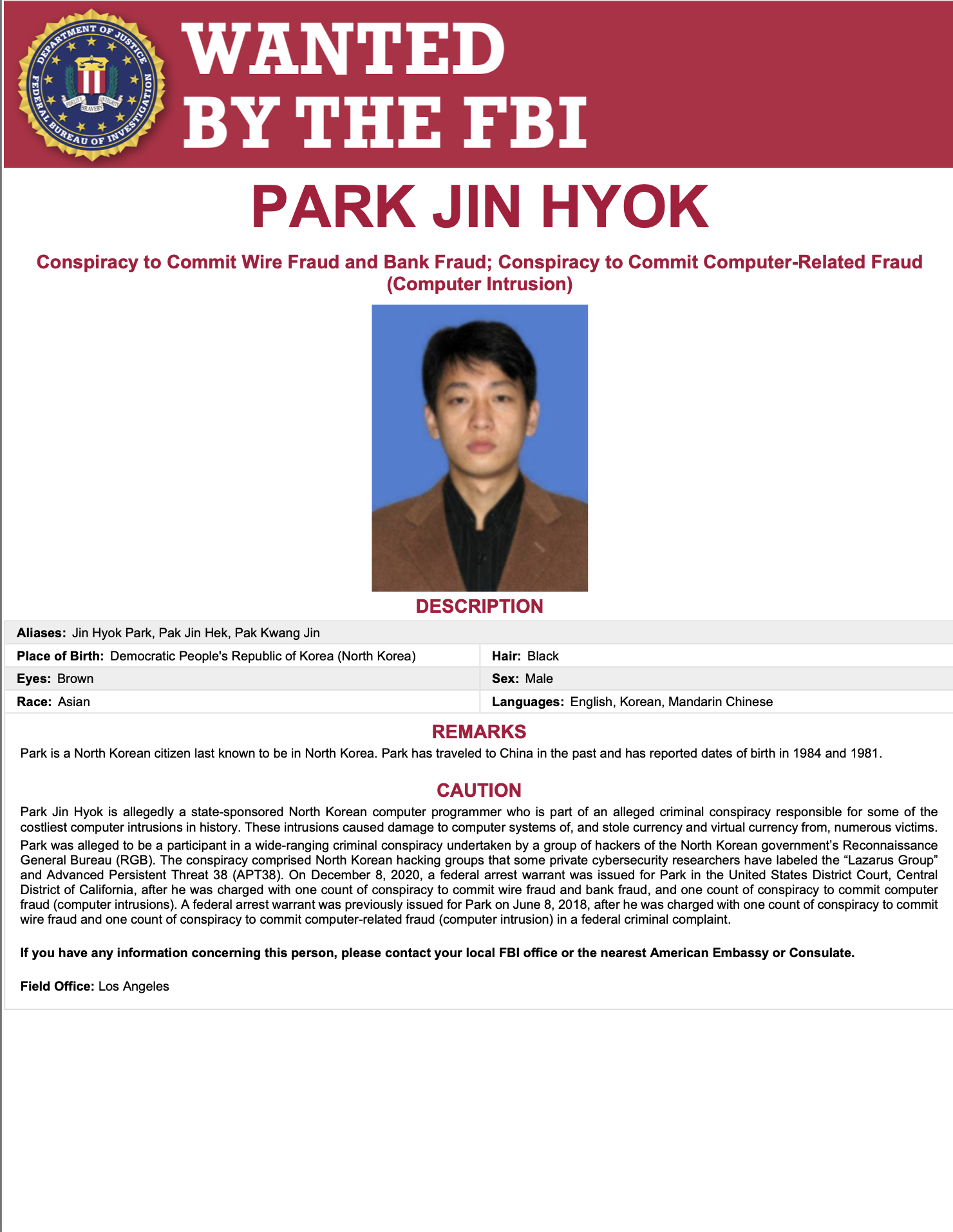 Park Jin Hyok is a US-indicted, state-sponsored North Korean programmer linked to the Reconnaissance General Bureau, accused of orchestrating large-scale cyber intrusions and theft of fiat and virtual currency as part of the Lazarus Group/APT38 network.