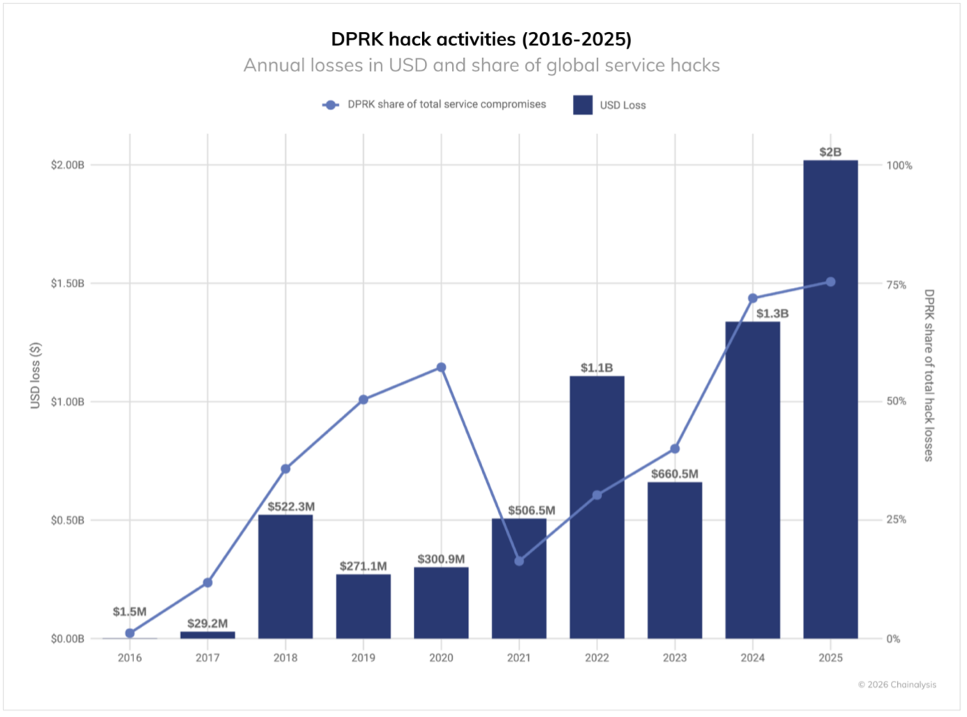 North Korean hackers stole $2.02 billion in cryptocurrency in 2025, a 51% year-over-year increase, pushing their all-time total to $6.75 billion despite fewer attacks.